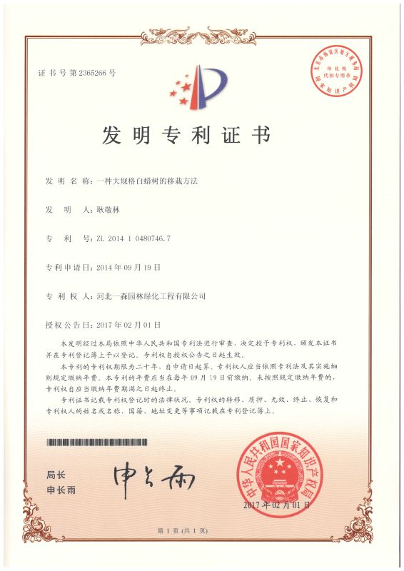 2017年2月1日,國家知識(shí)產(chǎn)權(quán)局頒發(fā)河北一森園林綠化工程股份有限公司“一種大規(guī)格白蠟樹的移栽方法”發(fā)明專利證書,專利號(hào)ZL201410480746.7,證書號(hào)2365266。本發(fā)明專利涉及樹木的移栽技術(shù)領(lǐng)域,移栽成活率高,投資少,簡單易行,效果好,效益高。在園林綠化工程中作用突出,好掌控,效果顯著。河北一森園林已建成全國知名的大規(guī)格白蠟基地,在本發(fā)明專利方法的指導(dǎo)下,大規(guī)格白蠟的移栽成活率高達(dá)95%。