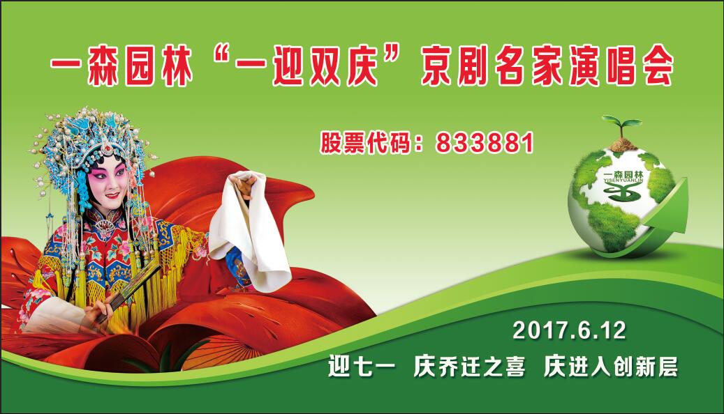 一森園林“一迎雙慶”京劇名家演唱會將于今晚8點(diǎn)在元龍國際酒店隆重舉行,屆時京劇梅花獎得主趙玉華領(lǐng)銜主演。“一迎”即迎“七一”,“雙慶”一慶一森園林登錄新三板創(chuàng)新層,二慶一森園林喬遷之喜,一森園林公司地址由河北省石家莊市元氏縣常山路131號京東大廈遷至河北省石家莊市元氏縣常山路180號元龍國際酒店6樓。