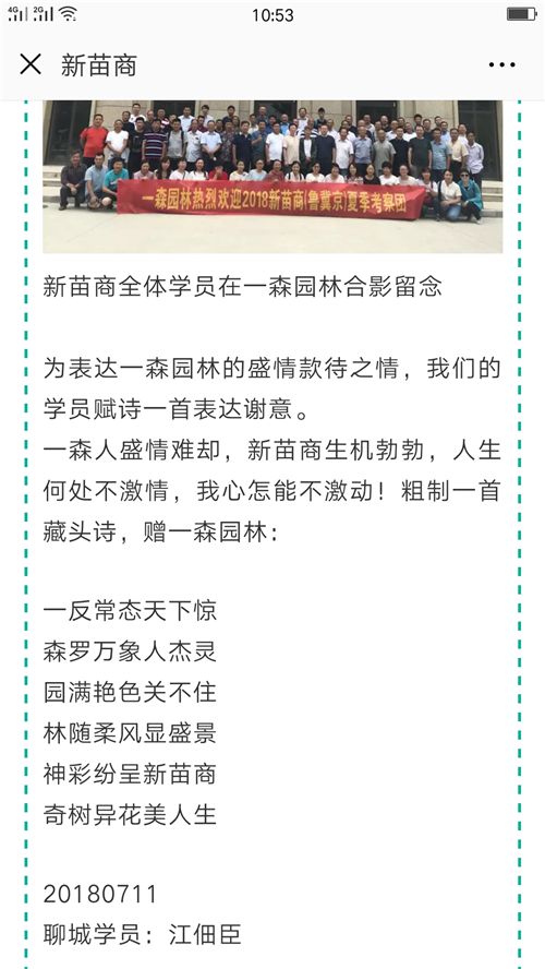 下面附上新苗商學員的藏頭詩一首:感謝新苗商學員對一森園林的贊譽