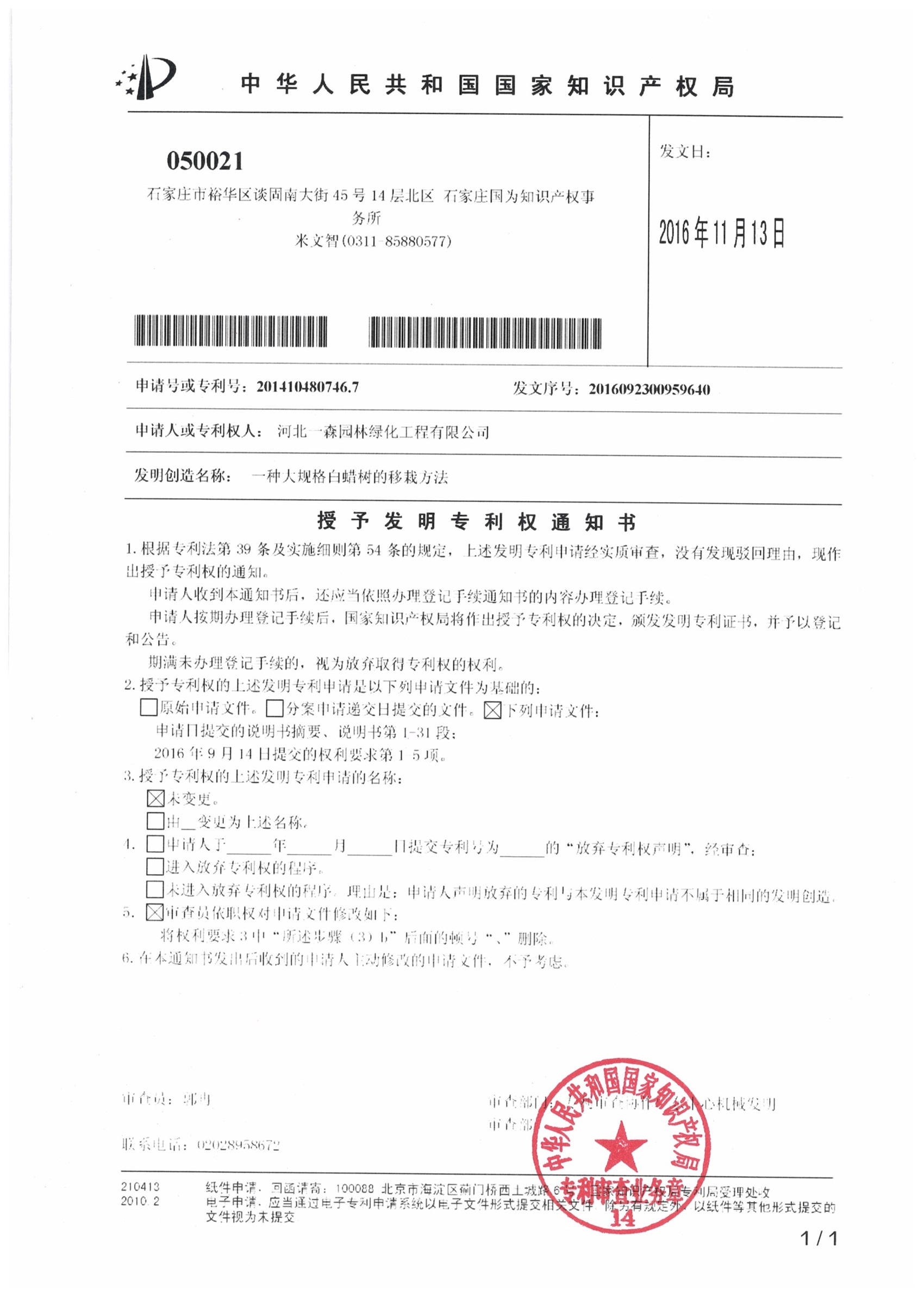 2016年11月13日,河北一森園林綠化工程股份有限公司收到國家知識產(chǎn)權局關于一森園林“一種大規(guī)格白蠟樹的移栽方法”被授予發(fā)明專利的通知,專利號201410480746.7。本發(fā)明專利涉及樹木的移栽技術領域,移栽成活率高,投資少,簡單易行,效果好,效益高。在園林綠化工程中作用突出,好掌控,效果顯著。河北一森園林已建成全國知名的大規(guī)格白蠟基地,在本發(fā)明專利方法的指導下,大規(guī)格白蠟的移栽成活率高達95%。